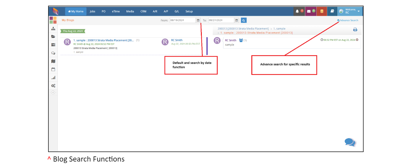 This window compiles all user blogs by date order starting with the latest blog. The window defaults to a week time frame, but you can search blogs for any time frame using the Date From: thru Date To: calendar picker. You can further refine your search with criteria selected from the ‘Advance Search’ fields.