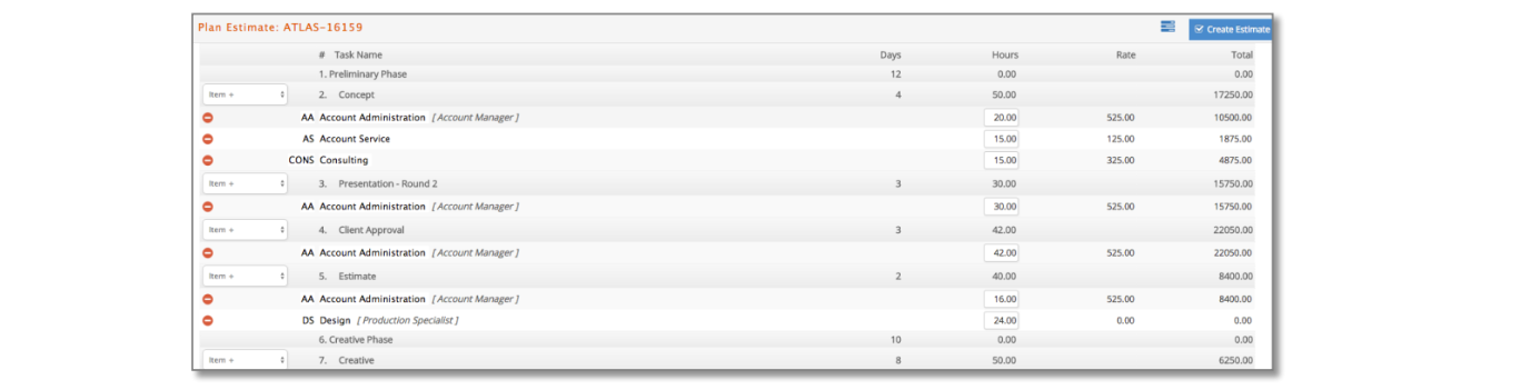 You can add or remove items as needed. Keep in mind, if you use this feature there is a direct link between the plan services and hours and the Estimate itself.