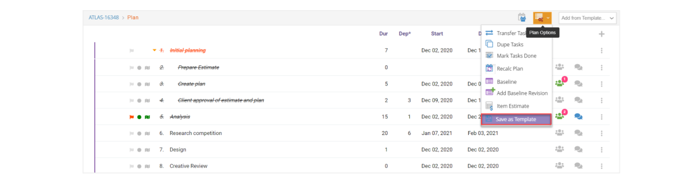- On the Plan window, click the “Plan Options” icon and select “Save as Template” on the dropdown menu: