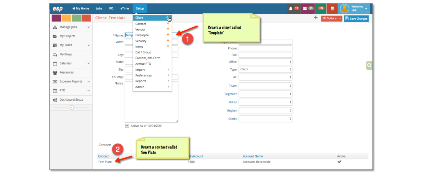 To set up an estimate template, you will need to start a job for each estimate template type. In order to create a job, you will need a Client called ‘Template’ and Client Contact with the first name of ‘Tem’ and the Last Name of ‘Plate’.
