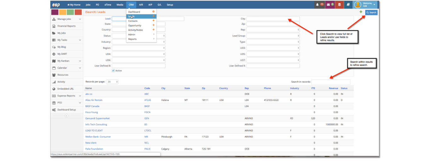 Click on CRM > Leads. From this window you are able to search or add new prospects into CRM.