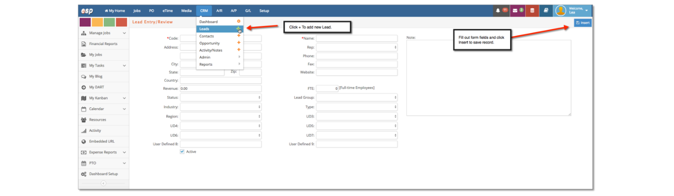 To add a new lead to the database, Click CRM > Leads > +. This will present a new window. Next, fill out all of the information most important to your processes. When complete, click the Blue Insert button in the top left. You can now continue with adding relevant information to the Lead such as Contacts, Notes and Opportunities.
