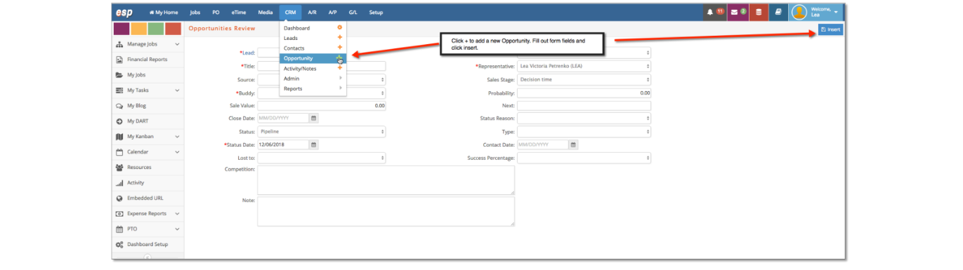 To add an Opportunity, click CRM > Opportunity > +. Then, fill out the form fields. As with Contact and Lead, you must fill in any required fields (*) in order for the entry to be saved. All other information is optional for creating an entry but is helpful with internal searching and reporting.