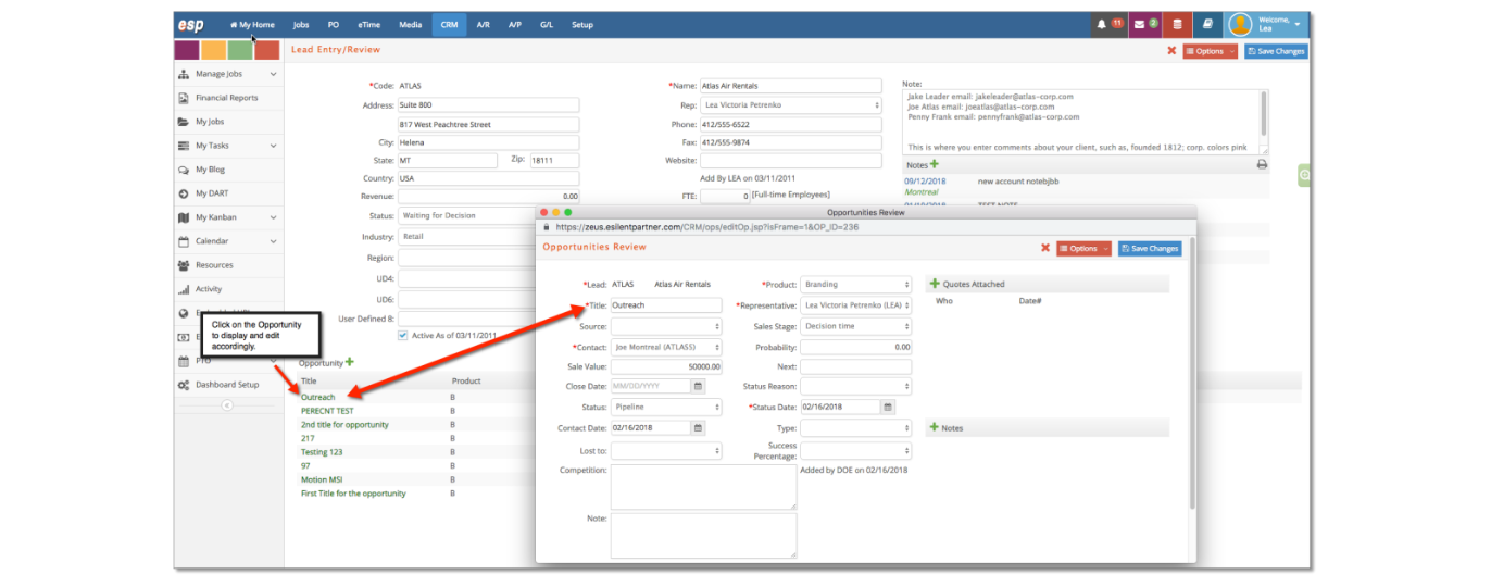 All Opportunities are listed at the central Lead’s record. Clicking on the Opportunity gives you access to display and edit the opportunity accordingly as information changes.