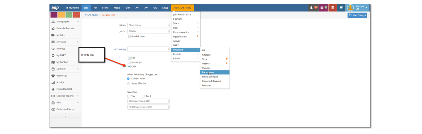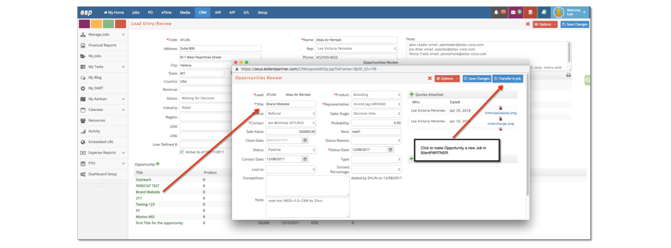 At some point, you may want to turn an opportunity into a job so you can track time, build estimates and manage the final deliverables just as you would for Client jobs. First, click on the Opportunity and then Click on the blue ‘Transfer to Jobs’ button. This will create a new job # for this Company.