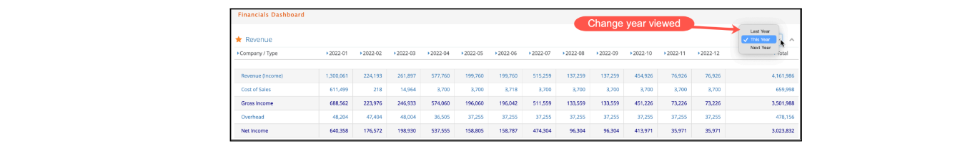 - My Home > Financials (Revenue): For users with Executive ePower access, a dropdown option is added to the upper right corner of the widget in order to change the view from ‘This Year’ (default) to ‘Last Year’ or ‘Next Year’.