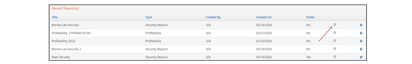 ○ Saved reports will be available from the My Home > My Saved Reports. Click the ‘ Run Report’ icon, as shown below, to open the Saved Report window