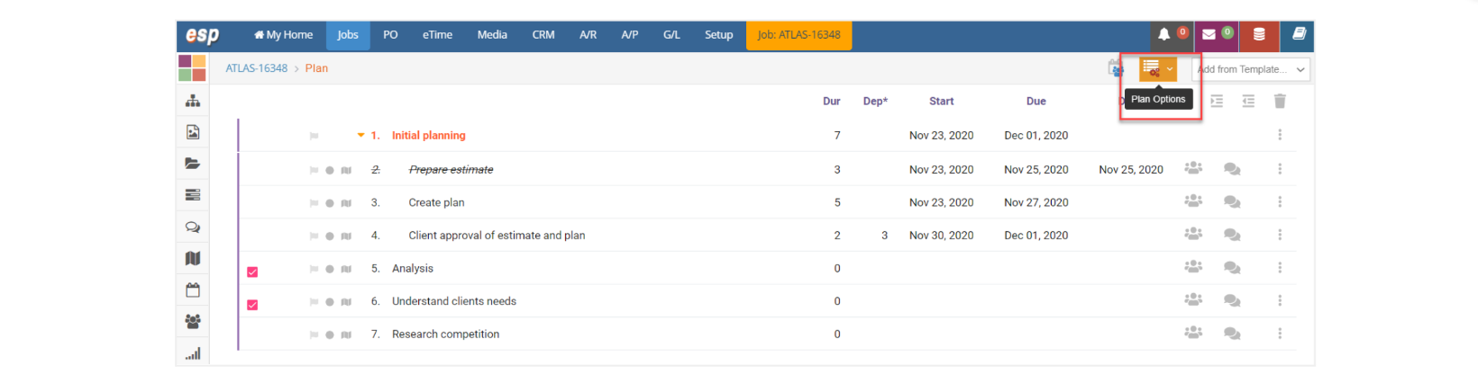 - Click on the “Plan Options” icon on the top bar to display the drop-down menu: