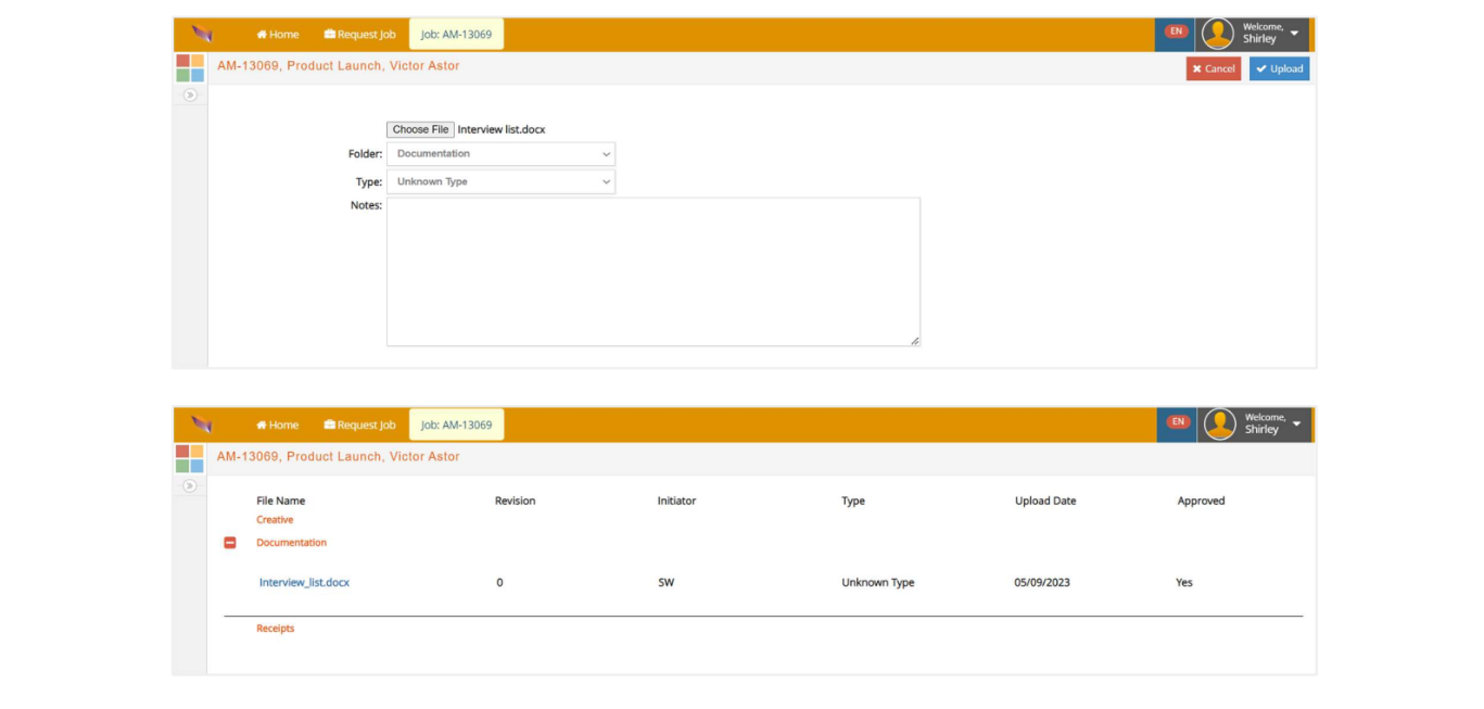 - client contact on eClient portal: upload assets through Job# > Upload Asset. Choose a file and click “Upload”. You should be able to see the asset in your eSP under Job# > Digital Assets after your client uploads it.