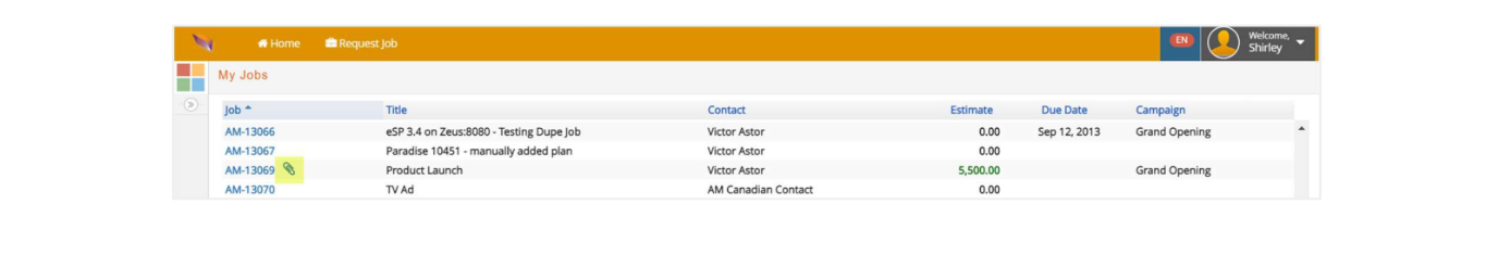 A client contact can view the digital assets he/she uploaded as well as the ones you shared with them. They can either go through Job# > Digital Assets, or click on the clip icon next to the job number on the Home window: