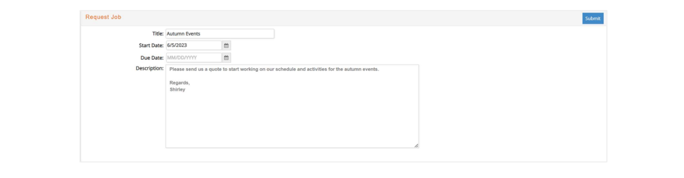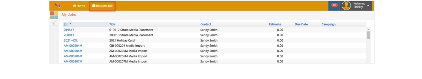 Your client contact can request starting a new job through the button “Request Job”. He/she should enter the job title, start date and description, and then click “Submit”. This will start a QUOTE job on e·silentpartner and send a bell alert to the AE for the Client.