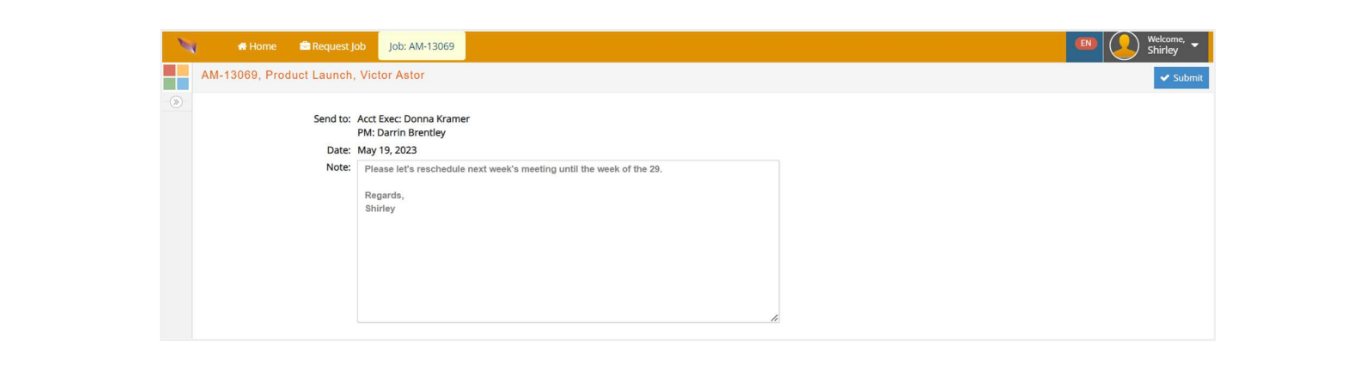 Your client contact can also send you notes through the eClients portal. They simply have to go to Job# > Send Note, enter the message in the corresponding text box and click “Submit”: