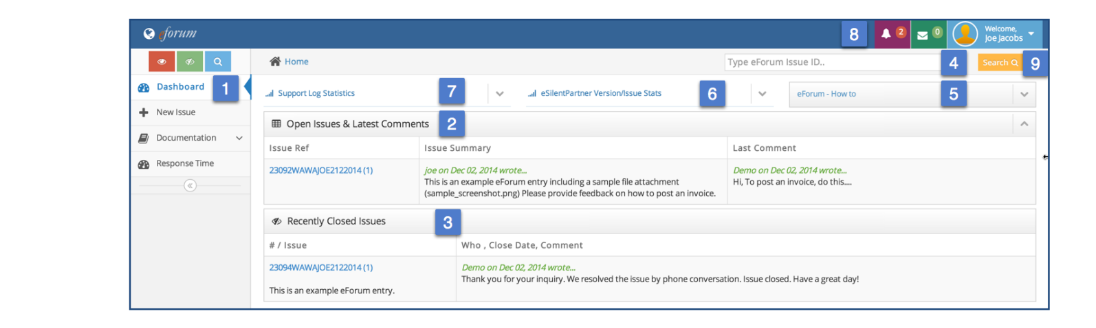 The main elements of the Dashboard will be explained using the graphic and legend that follows.