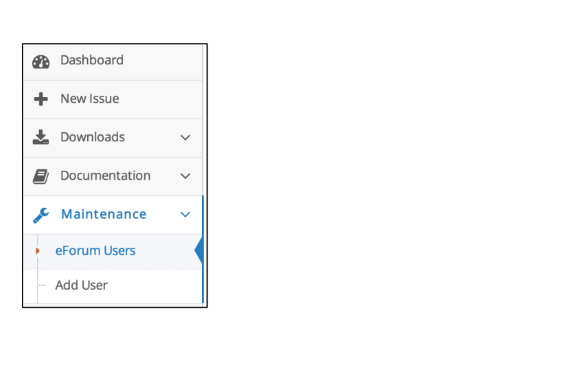 menu called ‘Maintenance.’ By selecting either ‘eForum Users’ or ‘Add User,’ the Administrator will be able to add users or view existing users assigned for your