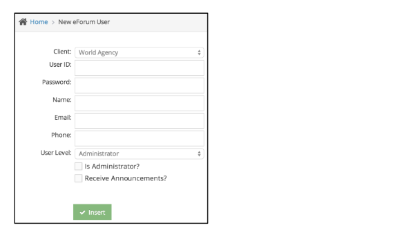 Fill in the information to include User ID, Password, Name, Email, Phone, User Level, etc. and the click ‘Insert.’