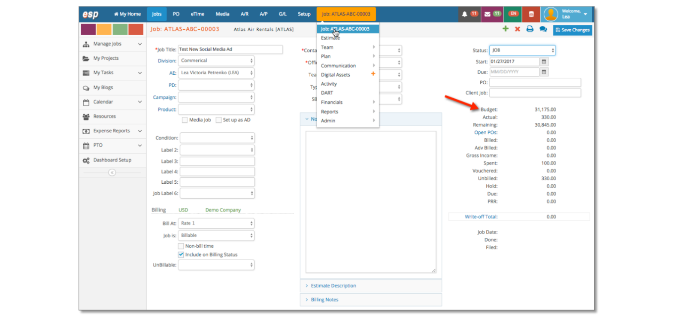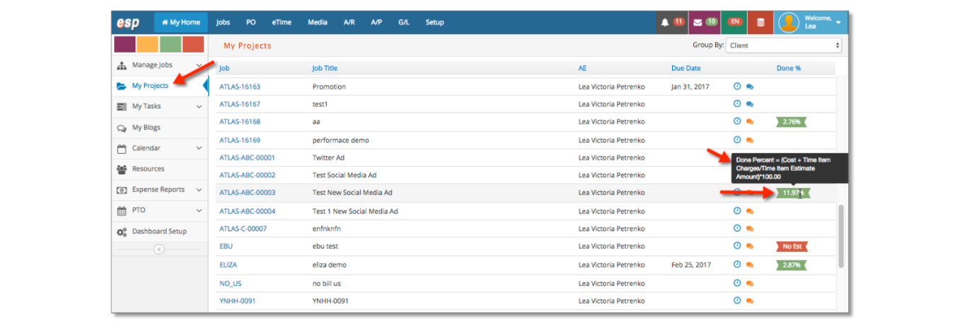To see a quick synopsis of where you stand against an estimate, go to your ‘My Jobs’ sidebar. If you have developed a Master Estimate, you will see a colorful flag in the far right column showing you the project’s percentage completion or burn rate.