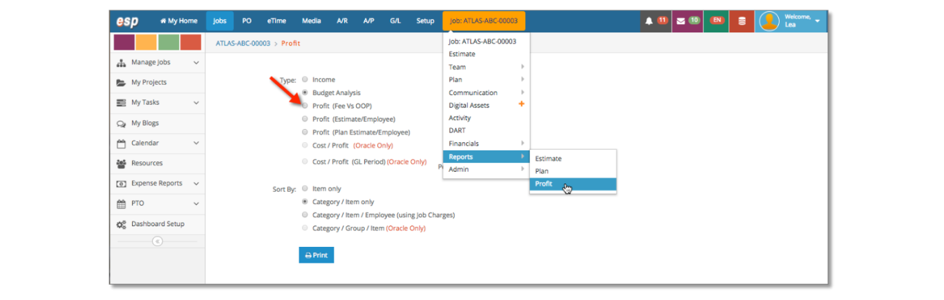 Select the Profit (Fee vs. OOP) radio button. The select your Sort By: option and click Print.