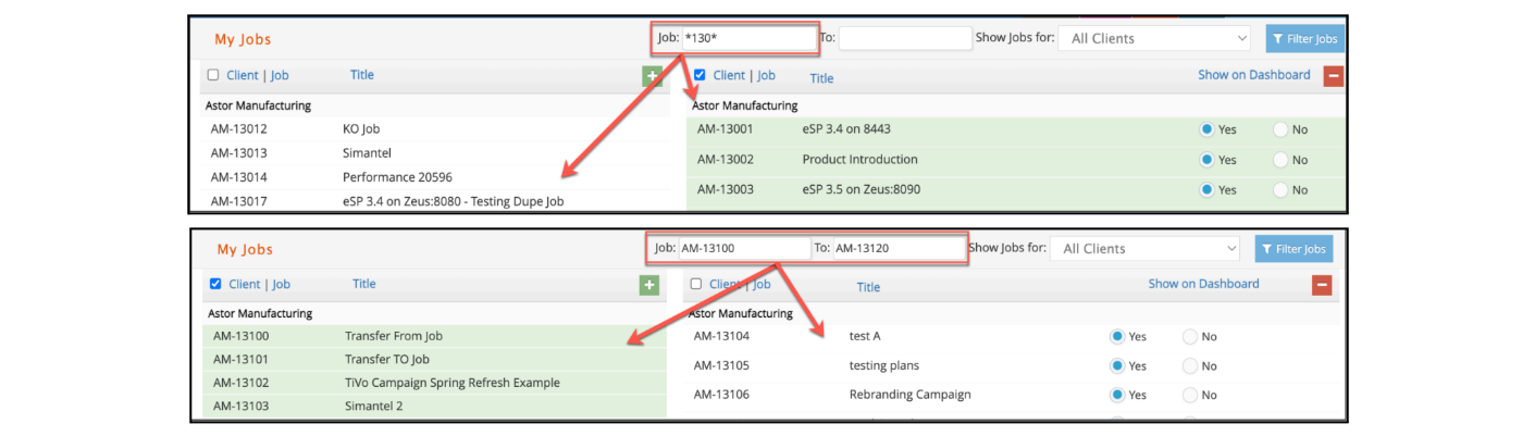 Example, searching for a job# range of AM-13100 To AM-13120 or searching with the asterisk as 130, AM-130* or *13002.