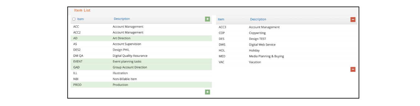 - To add Items for time charges, click on the items from the left side and click the green plus sign.