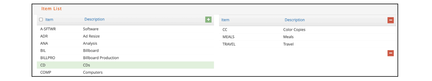 - To remove items, click on the items on the right side and click the red minus sign.