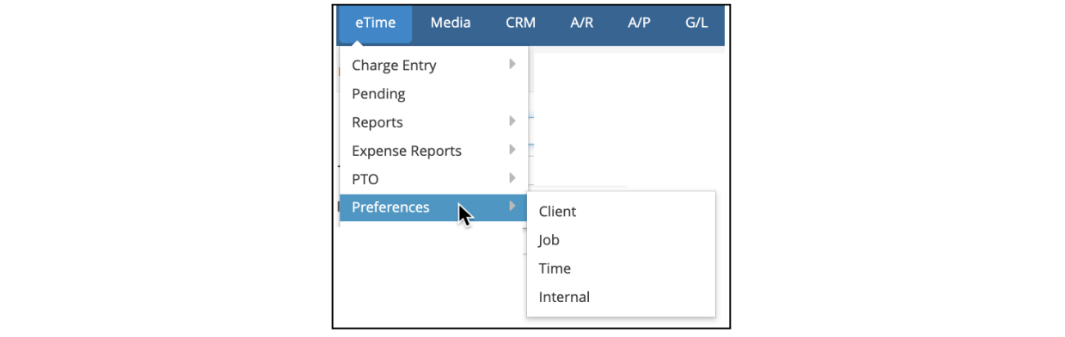 To use eTime effectively, every user must first set preferences related to Clients, Jobs, Time Items, and, if necessary, Internal Items. Once these preferences are established, the eTime drop-down lists will be populated based on the user’s preferences and the jobs to which the user is assigned.
