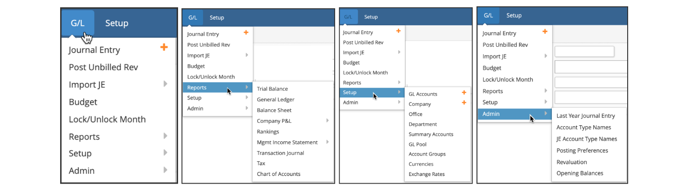 - GL Accounts: Use this function to set up your chart of accounts at the posting level and define ‘ownership’ (company, department and office).