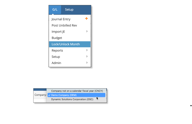 - Select Lock/Unlock Month from the G/L menu.