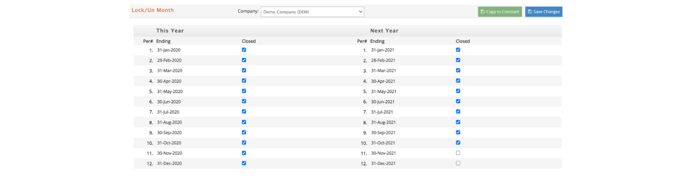 This feature allows you to lock as many months of This and Next Year as possible and 'unlock' them to accommodate future journal entries. This way, if you attempt to process a transaction for a 'locked' month, you will be warned and the processing will stop.