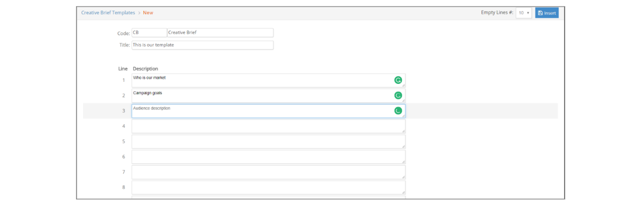 To add a new template, click on the plus icon on the top right of this window. You will need to enter a code and title, select the number of lines you need (once created, you can always add more lines) and you can start typing your questions.