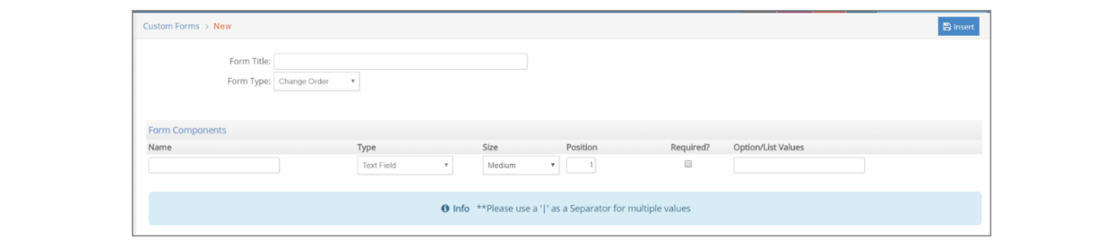 To add a new custom form, select a type from the ‘add New...’ box on the top right of this window. You will need to enter a title before you can start building your form.