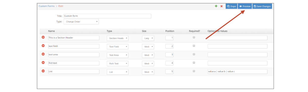 Every section must have a title (name), a type, a size, a position (order in which the section will appear in the form). You can also determine if a section is required or not, and provide a list of values (for Radio Buttons, List and Check box types).