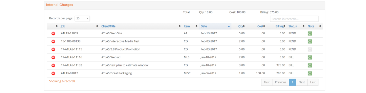 Invoked from Jobs > Job Charges > Internal, this screen enables you to view or modify previously entered internal charges, such as color copies or CDs for example, or enter new internal charges to Jobs.