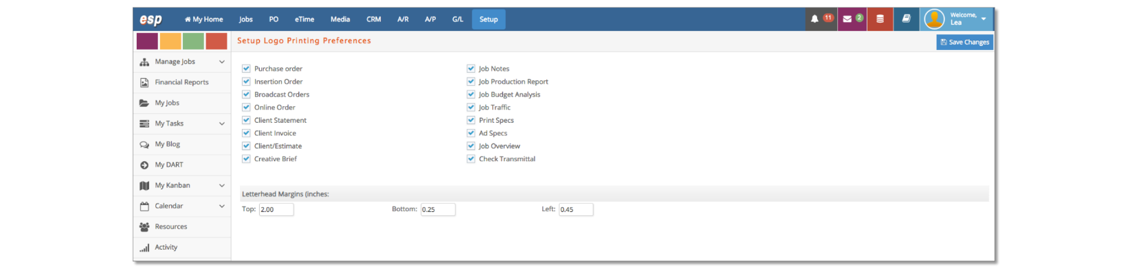 Go to Setup > Preferences > Logo Printing, make note of the current e·silentpartner settings and set your letterhead margins for e·silentpartner reports with logos. You can use Top 1/Bottom 0.25/Left 0.45 as a starting point. This can be adjusted later if needed.