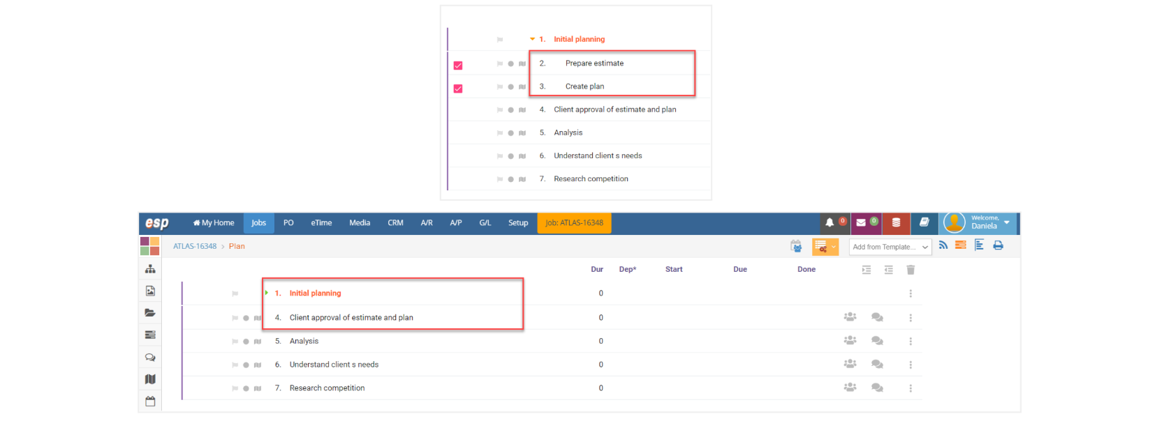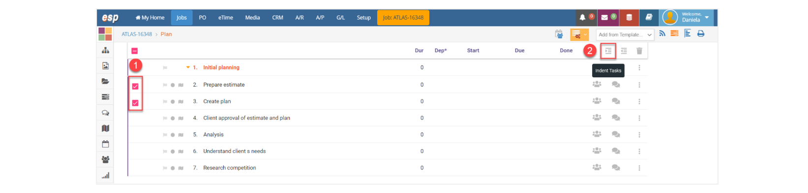 - To place tasks under a milestone, select the corresponding tasks and click on the icon “Indent Tasks” :