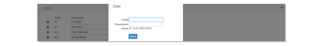 icon to open the add Color insert window. Enter a Code, Description and click the Insert button to save to the database.