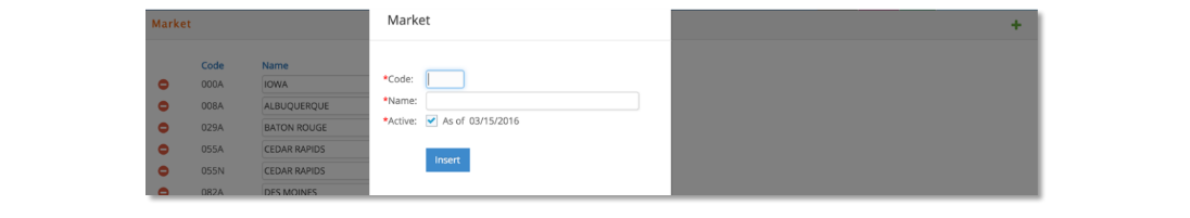 icon to open the insert window and add a new market code. Enter a Code, Name and click the Insert button to save to the database.
