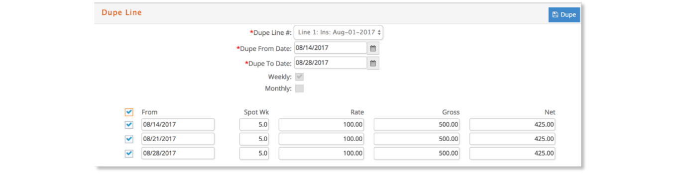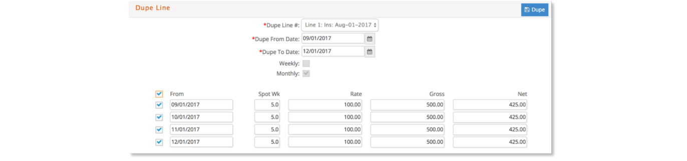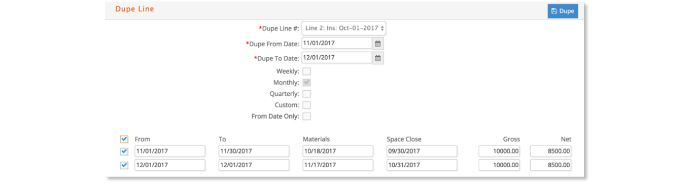 From the Dupe Line window, enter the From and To dates, then select one of the check to dupe as Weekly, Monthly, Quarterly, etc. and when ready, click the Dupe button,