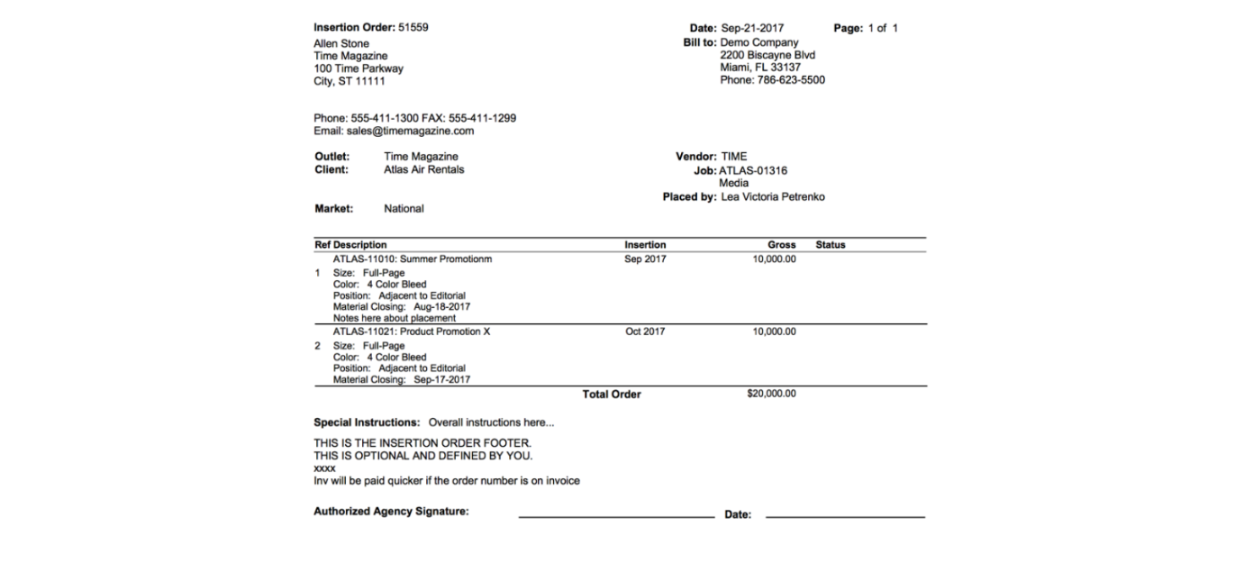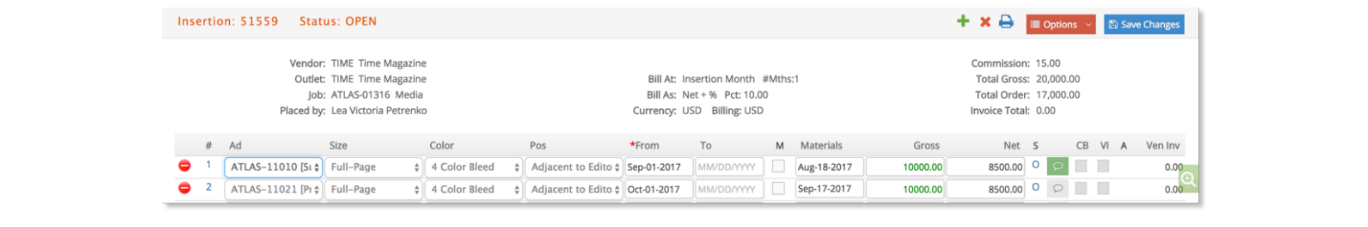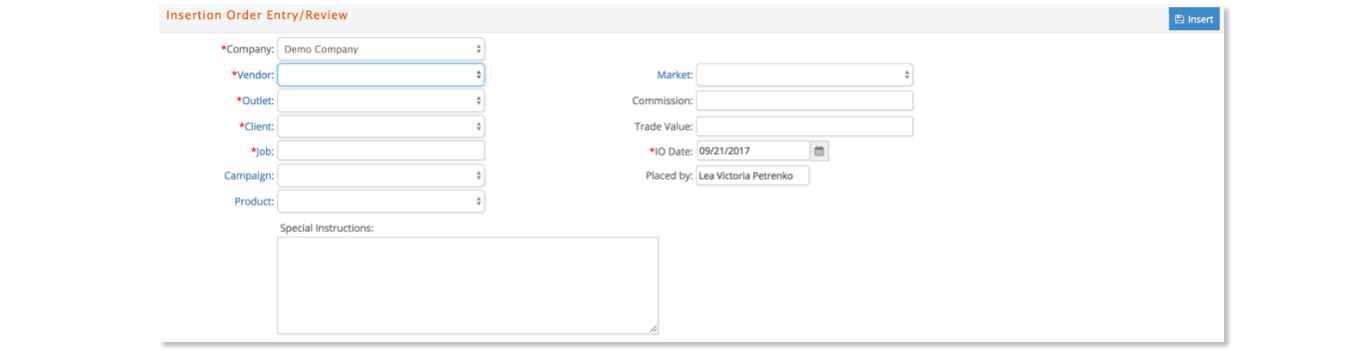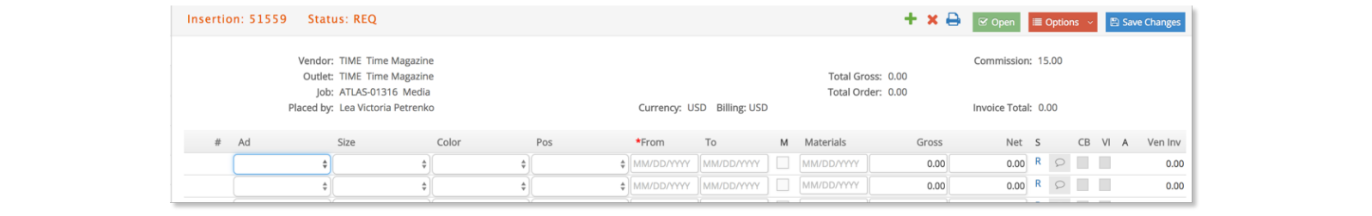 - Insertion Order Details: Optionally specify Ad, Size, Color, Position, To date and Materials close date.