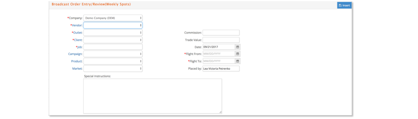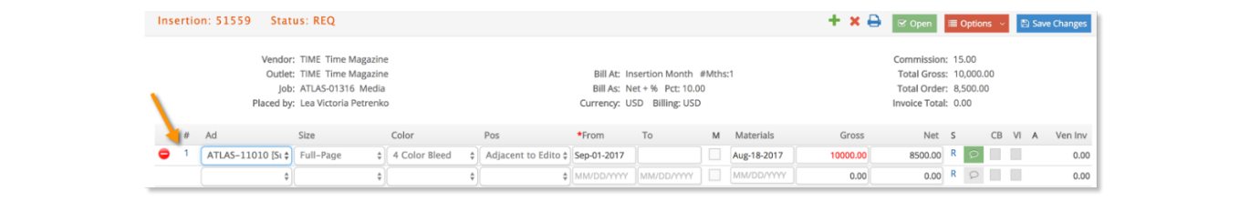 - All Order Details: Placement information is required, such as the from date for each line, spots per week or quantity, Gross/Net amounts. The net for each line will calculate based on commission % in header, typically set at 15%.