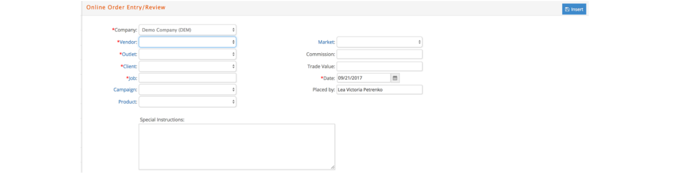 The first step in creating an order is to create the media order header. The header is where you will add details such as company, vendor, outlet, client, job, etc. In all cases, selection of the vendor is the first selection. Required fields are noted by a red asterisk next to the field label. All other fields are optional.