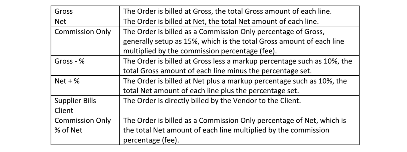 If the billing instruction to the supplier is to bill the client directly or as commission only – then e·silentpartner will not update the vendor commitment to the job. However, this order will still remain as part of your database as a placement. Please review the Media Admin User Guide for more information on setting up Client Billing parameters.