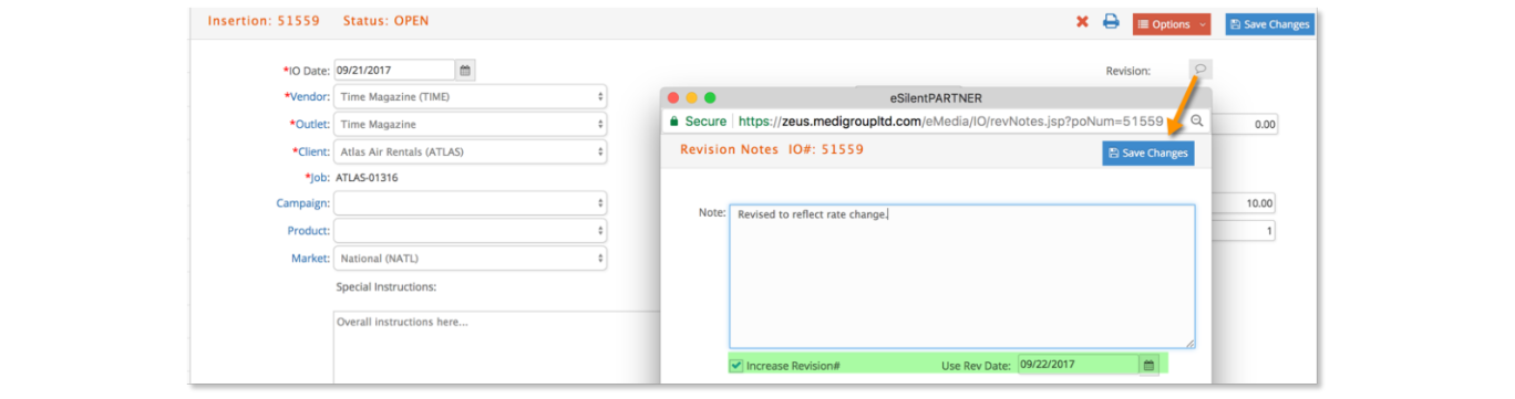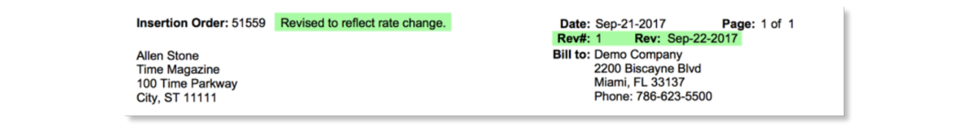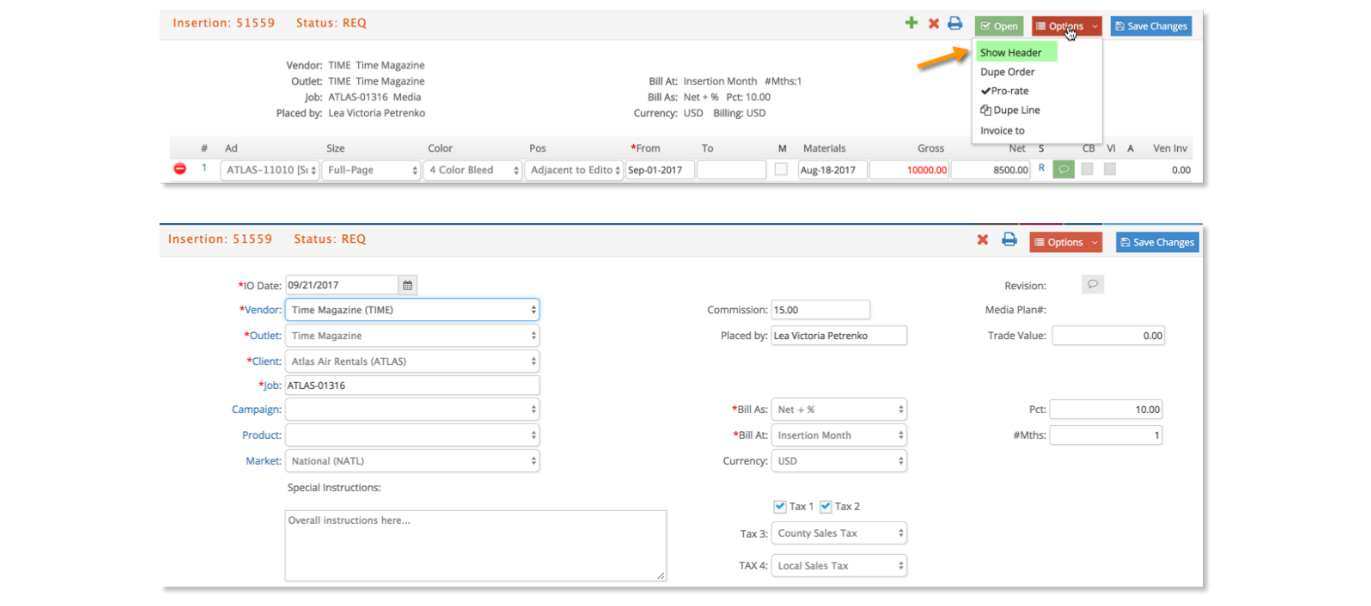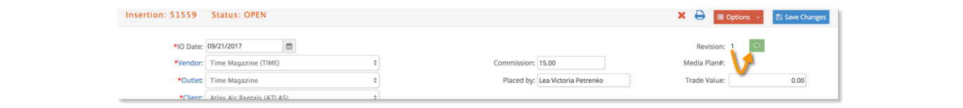 There may be instances where you want to clearly show that a media order has been revised and the date it is revised. To do so, under the Options – Show Header window, select the comment icon near Revision as shown in the graphic below.