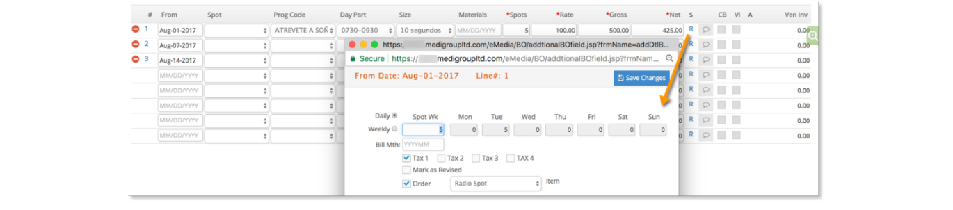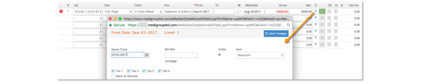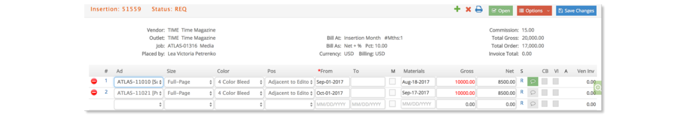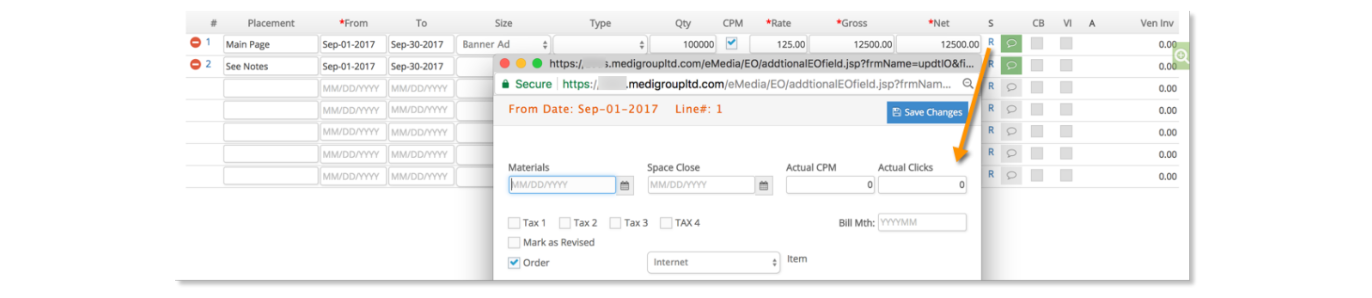 Once the header is created, you will be directed to the order detail window where you begin to enter information regarding each specific line on the media order before clicking Save Changes.
