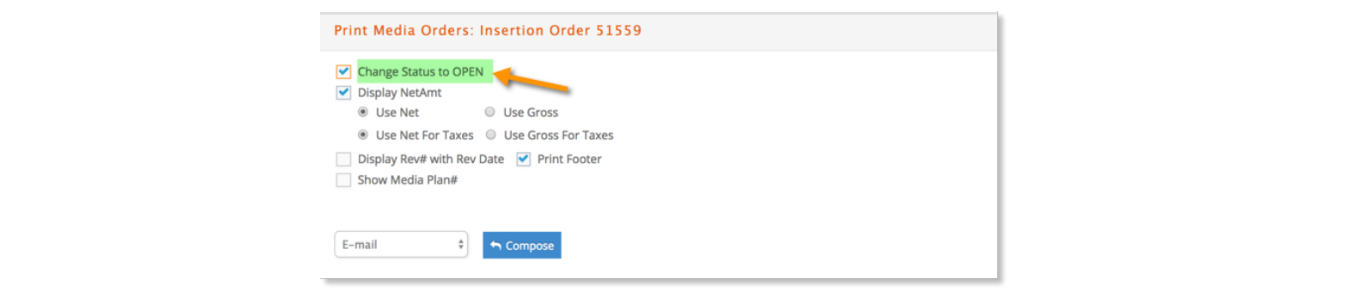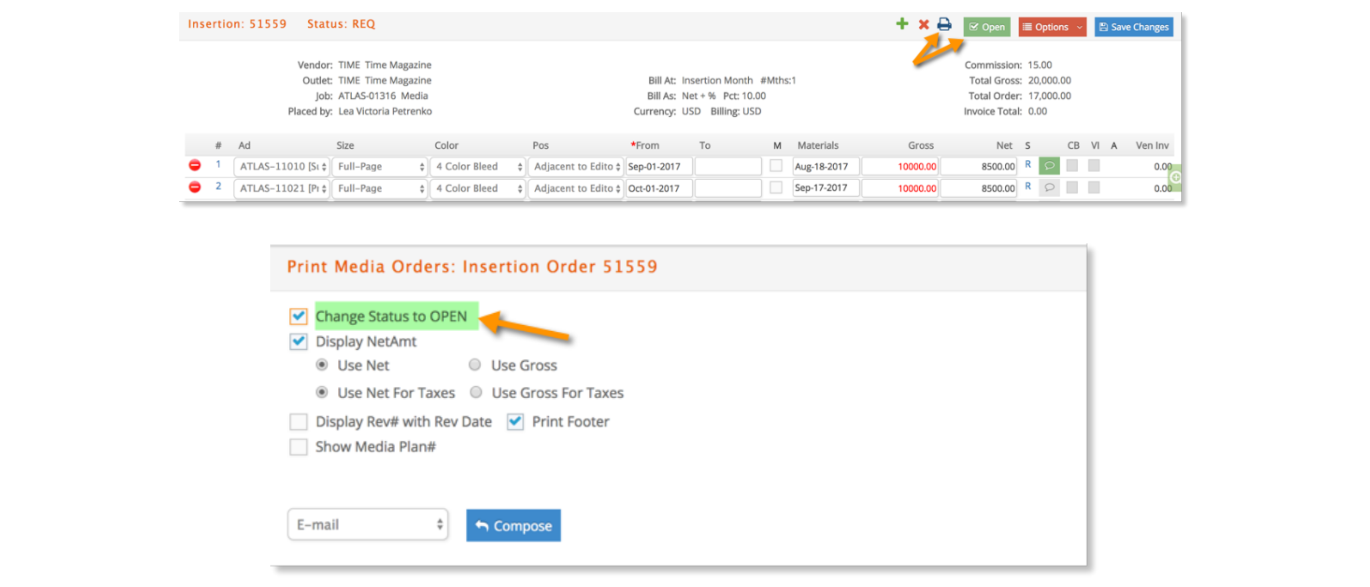 To change a media order from REQ to OPEN, select the ‘Change Status to OPEN’ checkbox. Once the order is printed, all lines on the order will change from ‘R’ to ‘O’ as shown here: