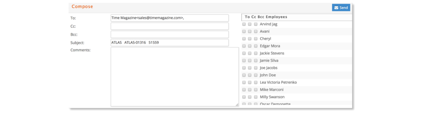 Should it be necessary, the user may also choose to email the order directly from within e·silentpartner. To do so, select Email from the drop-down list which will then open a compose email window, as shown below. Here you will enter the email information such as To, cc, bcc, subject line, and text. Upon sending, the email is sent with the order as a pdf attachment. Initially, you may want to test this by sending yourself an email to be familiar with the entire process.