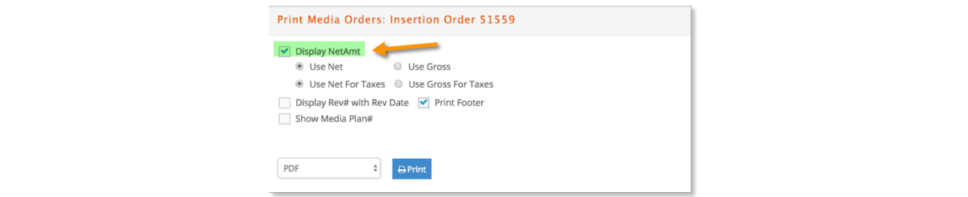 If the ‘Display NetAmt’ checkbox is checked, in addition to the Gross Amount printing on the report, the user will have the option to generate the printed order using a combination of the radio buttons; Use Net or Use Gross and Use Net for Taxes and Use Gross for Taxes as shown in the graphic below.