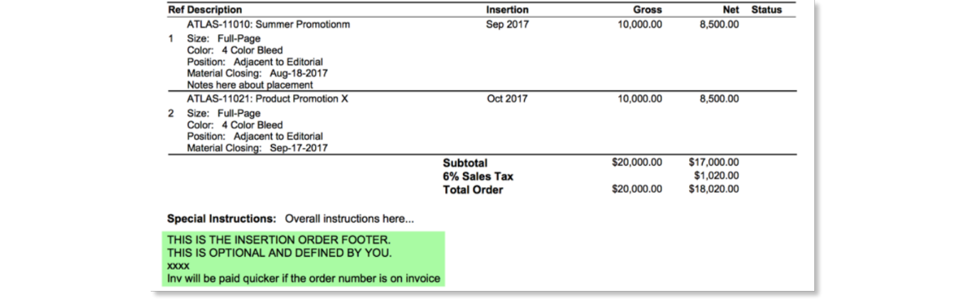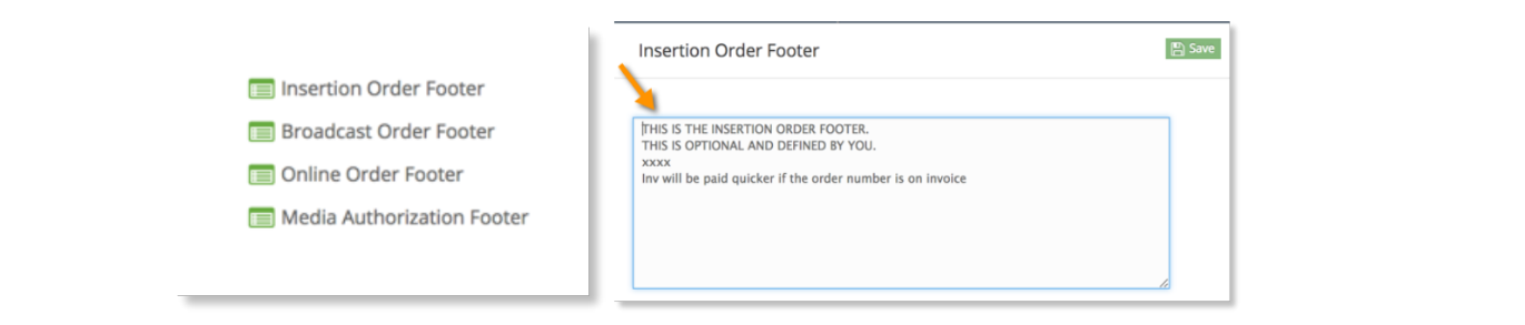 The media order footer information is company specific and may be tailored for each order type. The setup is found under Media – Admin – Preferences and a sample Insertion Order Footer is shown here:
