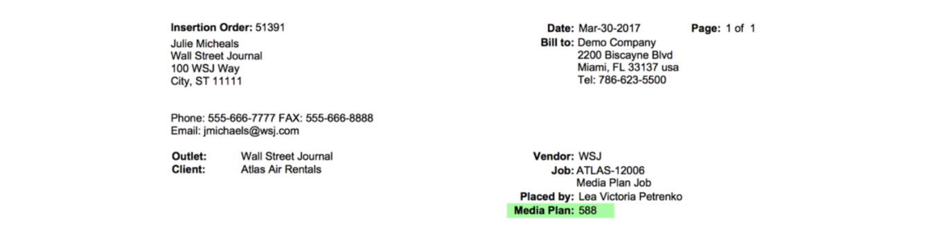 Lastly, if selecting the ‘Show Media Plan#’ checkbox, the generated order will display the Media Plan number and is displayed on the order in the location shown here: