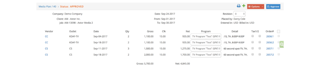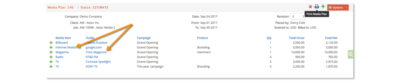Once a media plan has been created, and the user is ready to start generating orders from the plan, click the blue Media Item or the Outlet label to review and approve placements as orders.