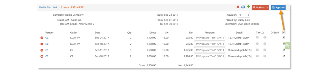 From the following window, media lines to be converted to an order may be selected individually or all at once by checking the select all checkbox as shown below. Once lines have been selected, click the Approve icon,